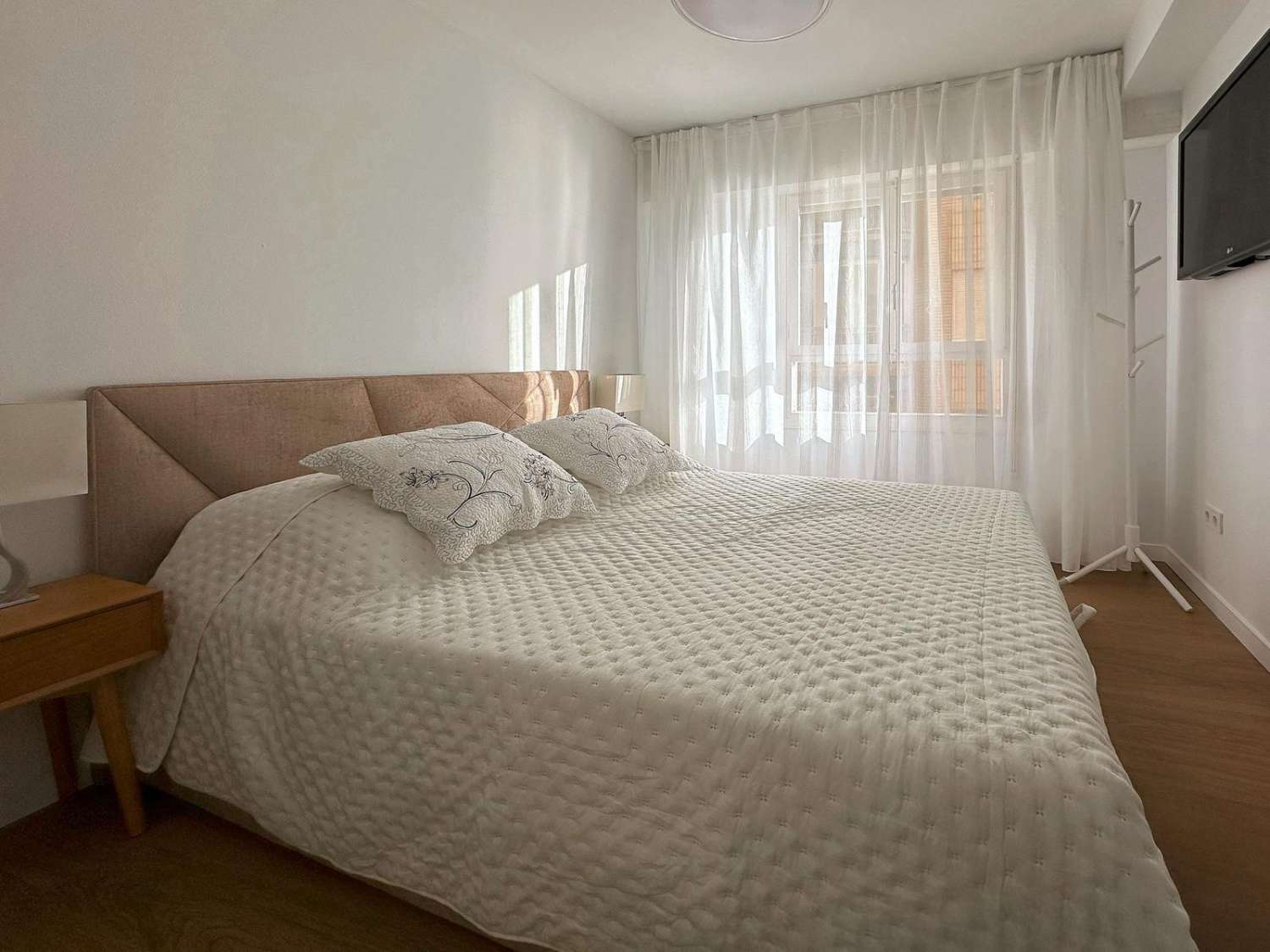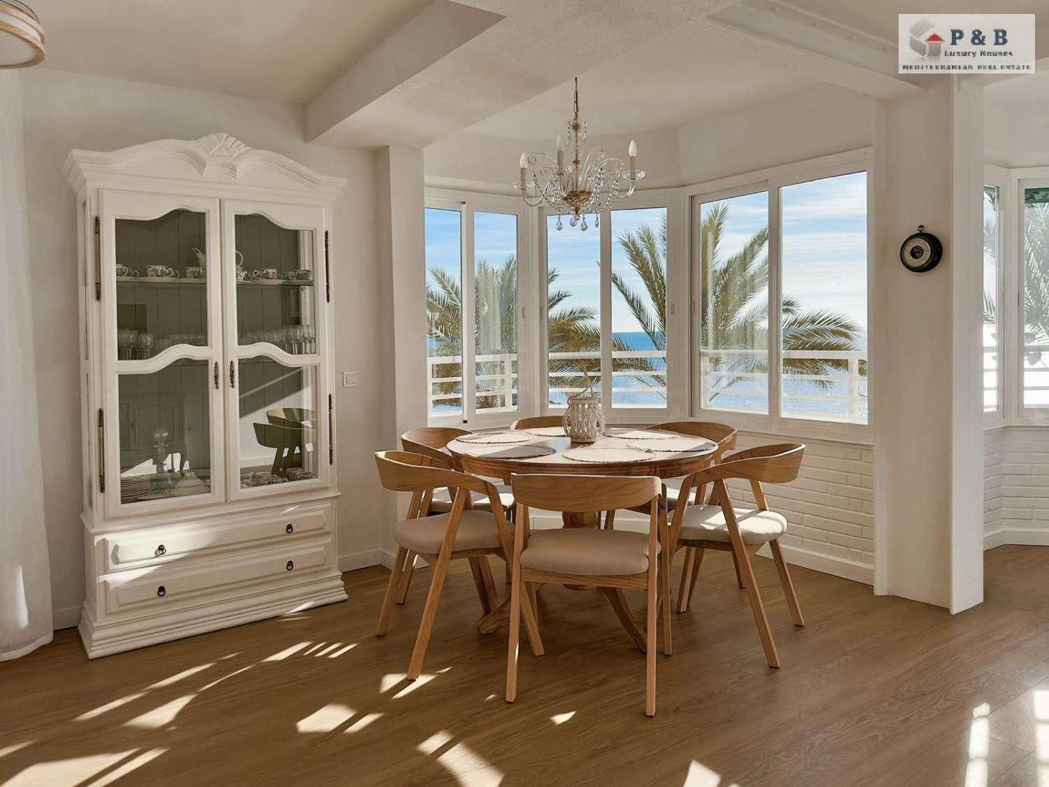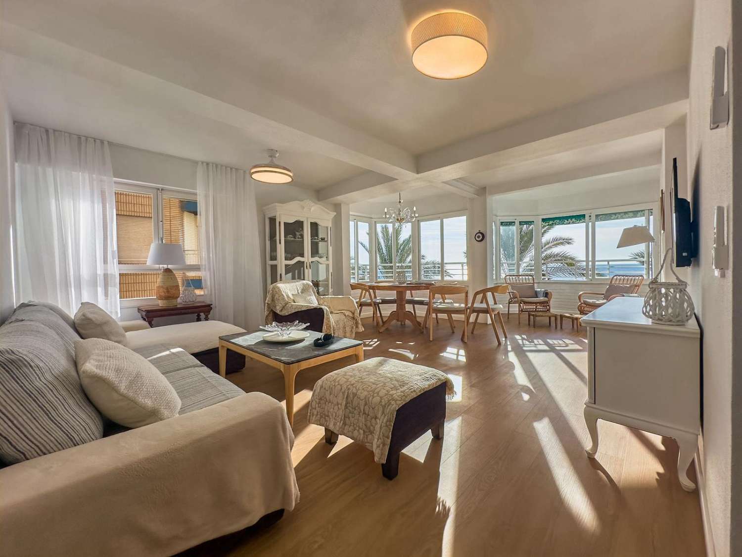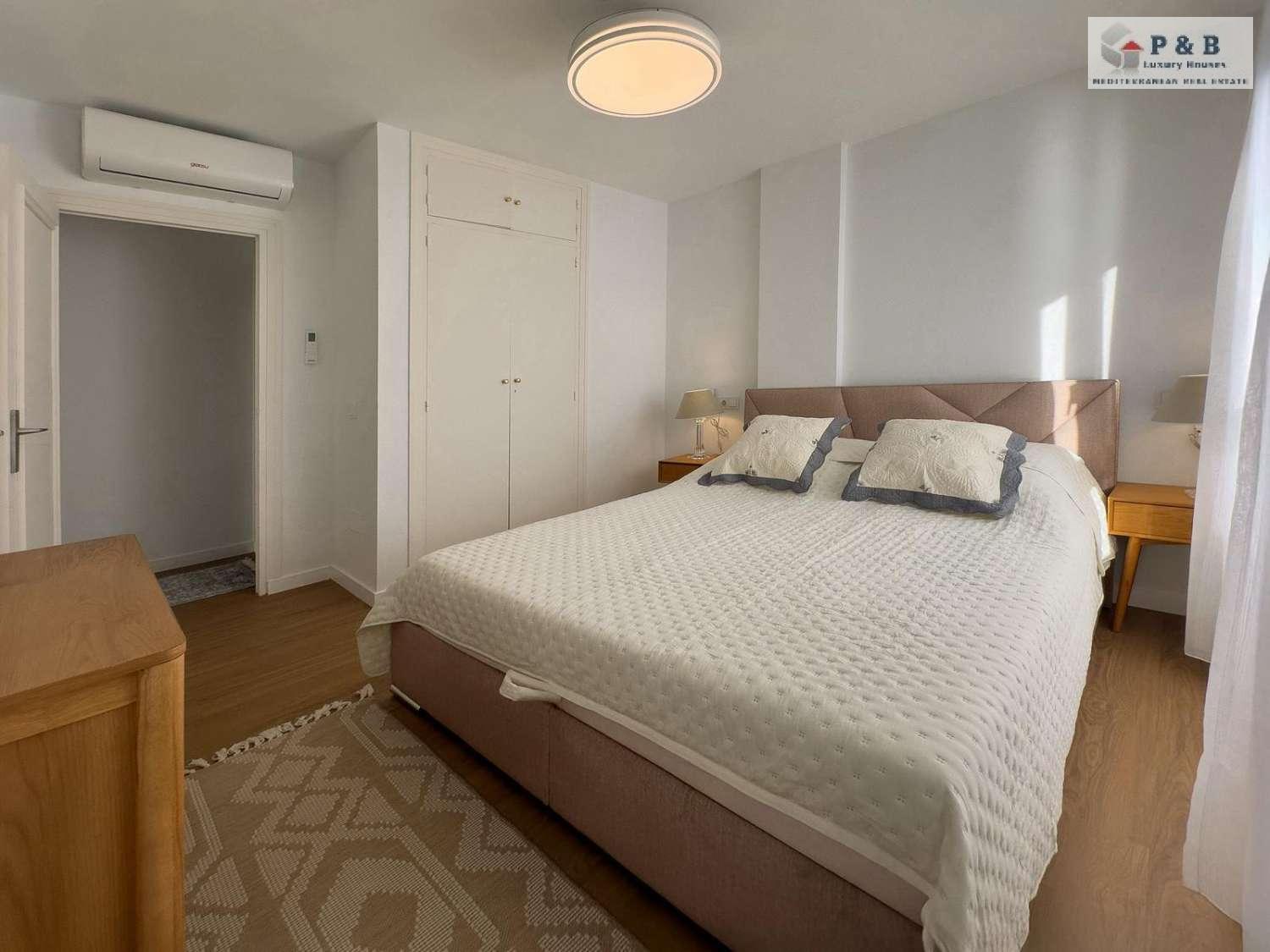 Imagina un increíble apartamento de tres dormitorios, 2 baños con vistas frontales al mar. Al entrar, el salón es amplio y luminoso, con grandes ventanales que permiten disfrutar de una vista panorámica espectacular al mar. El mobiliario moderno y elegante en tonos neutros, combinado con toques de madera natural, crea una atmósfera cálida y acogedora. El salón cuenta con un cómodo sofá de diseño, mesas auxiliares de estilo contemporáneo y una zona de comedor con vistas al mar, ideal para cenas con amigos o familia.