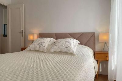 La cocina, abierta al salón, es de concepto moderno y completamente equipada con electrodomésticos de alta gama, una isla central y una barra para desayunos. Las encimeras de mármol blanco y los armarios lacados en tonos suaves completan la estética elegante y funcional.