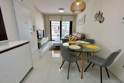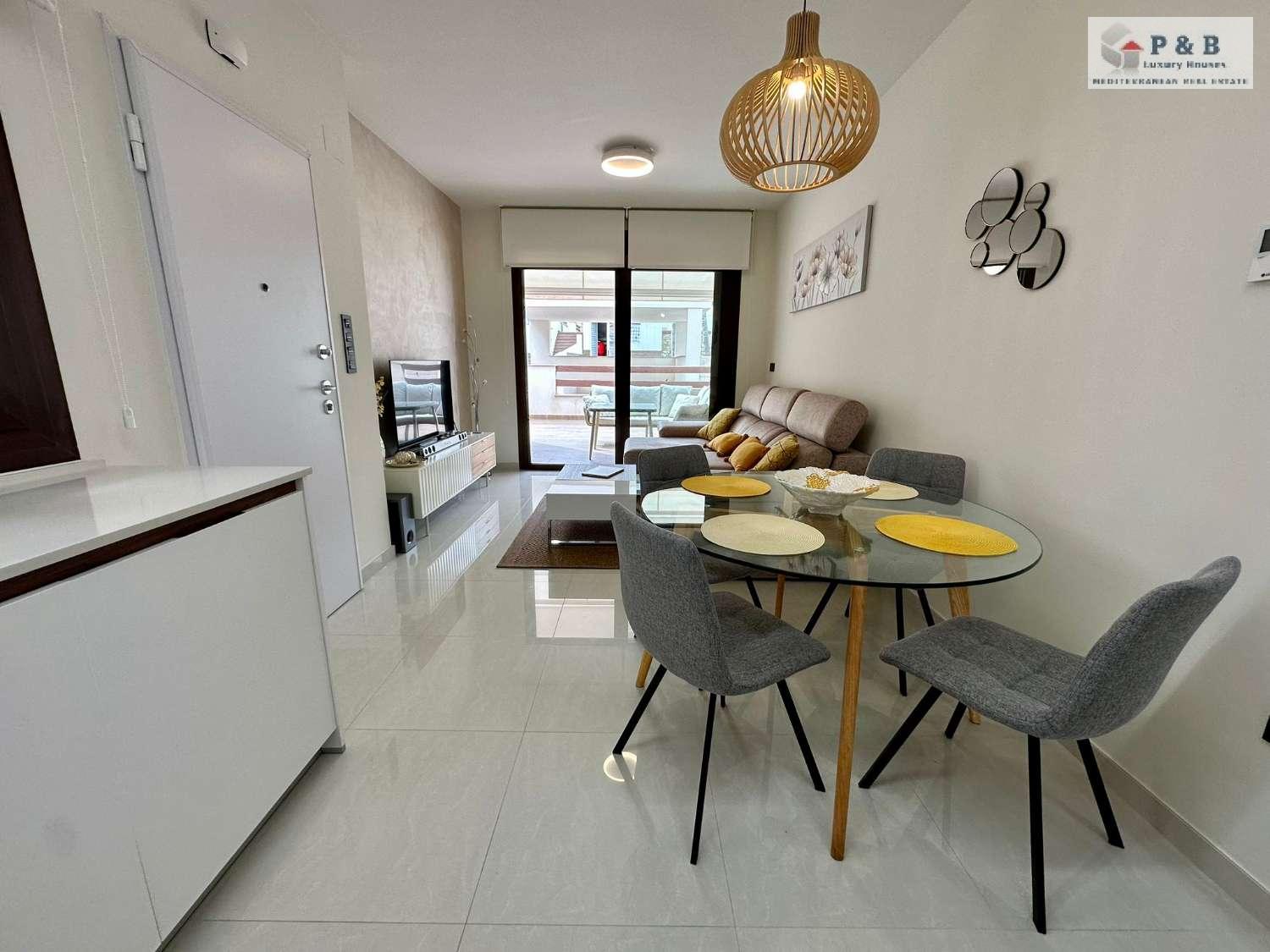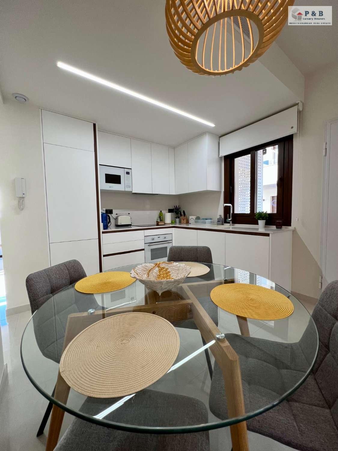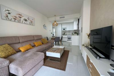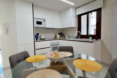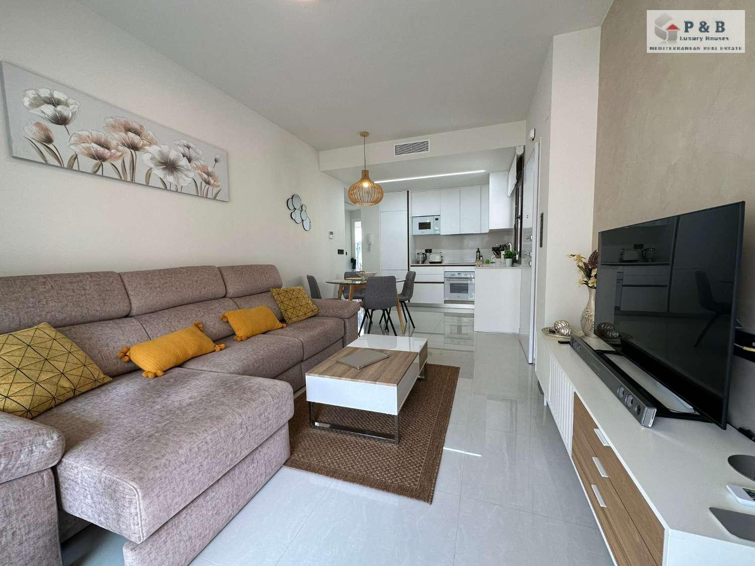 Cocina abierta al salón, plaza de garaje y trastero, la vivienda se vende totalmente amueblada y equipada, localizada en un residencial con 2 piscinas y zonas ajardinadas.