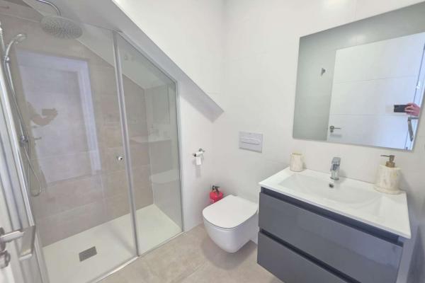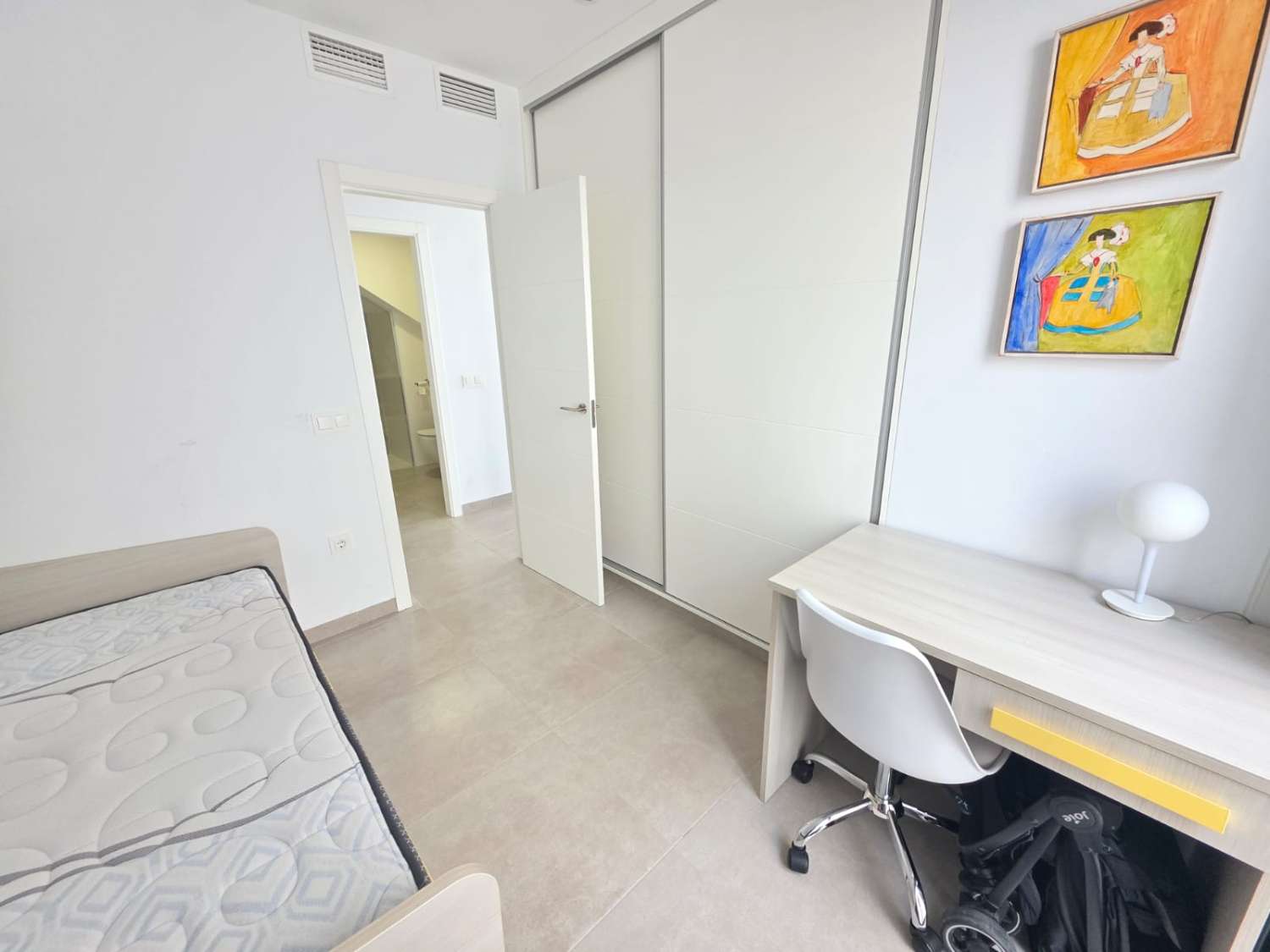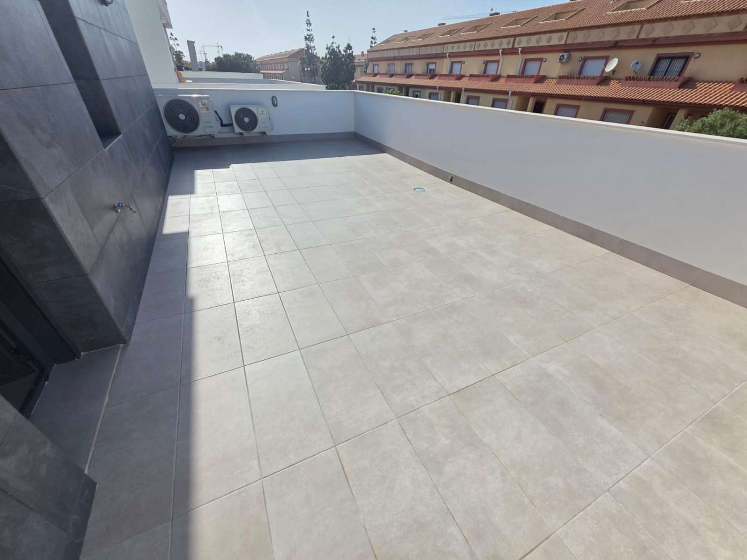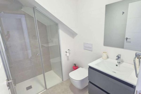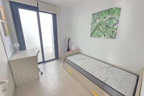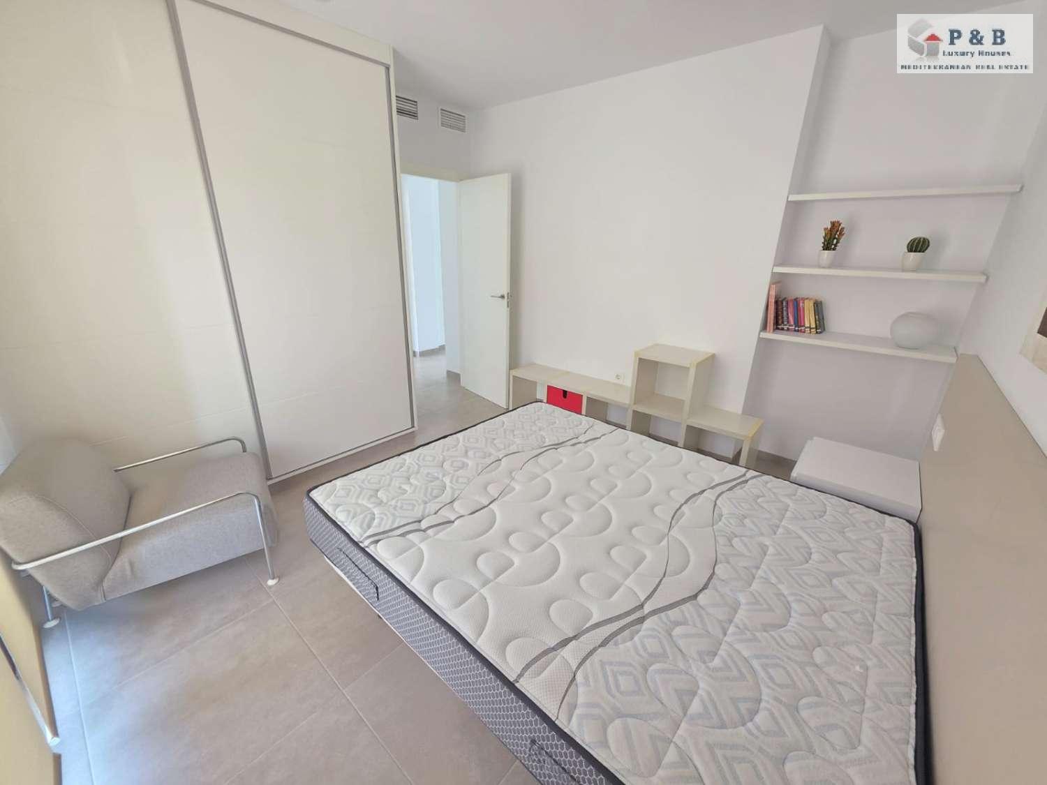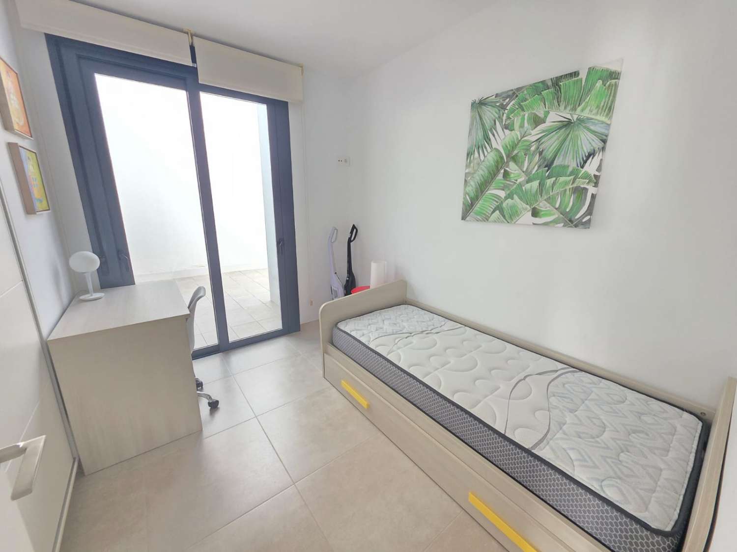 Con una superficie construida de aproximadamente 200 m², la propiedad se distribuye en dos plantas y cuenta con 4 amplios dormitorios y 3 baños completos, uno de ellos en suite. El dormitorio principal dispone de vestidor y acceso a una terraza privada con vistas parciales al mar.